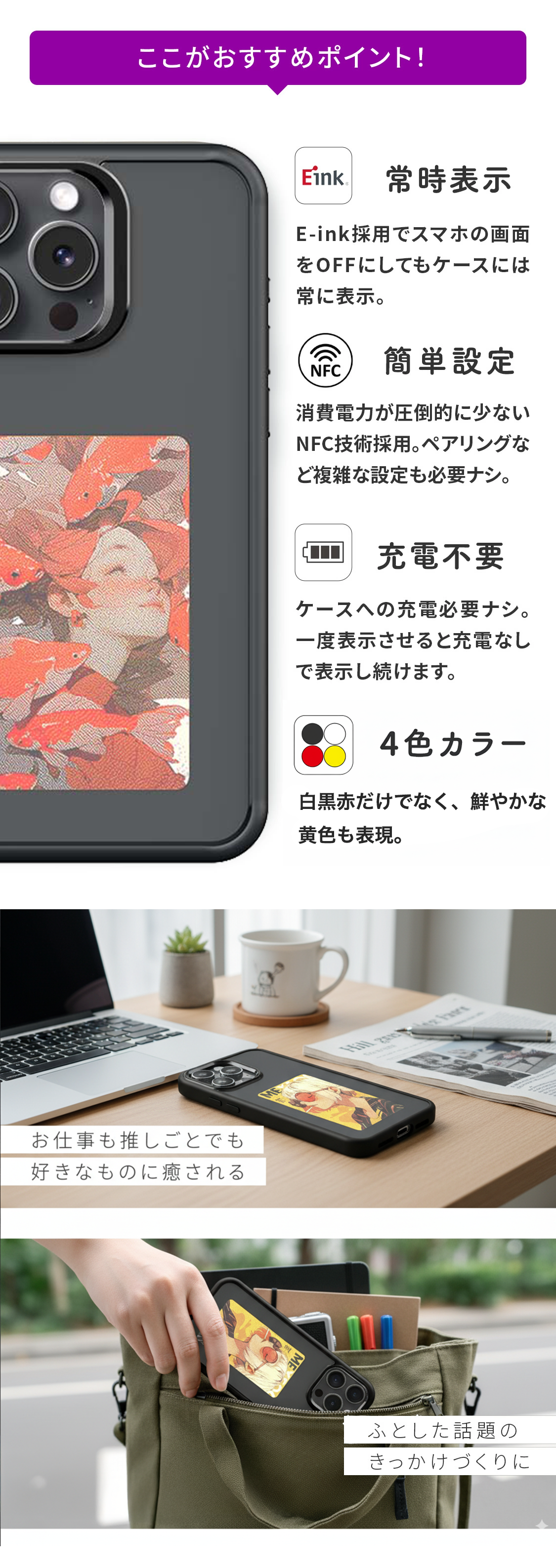 E-ink だから バッテリー消費ゼロ。充電切れでも画像が残る安心感を実感
